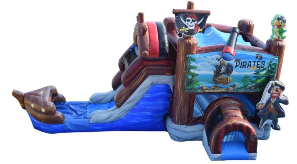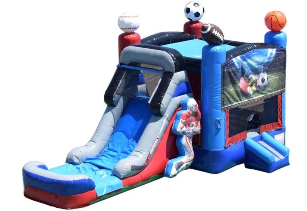 Enjoy super bouncy sliding fun with or without water with the Tropical Combo. Towering palm trees stand around your bouncy house to give it tropical feel no matter where you live. Enter the safe closing bouncy house and jump, bounce or try to make a basket through the enclose hoop. Then climb the rock wall up to the giant slide.